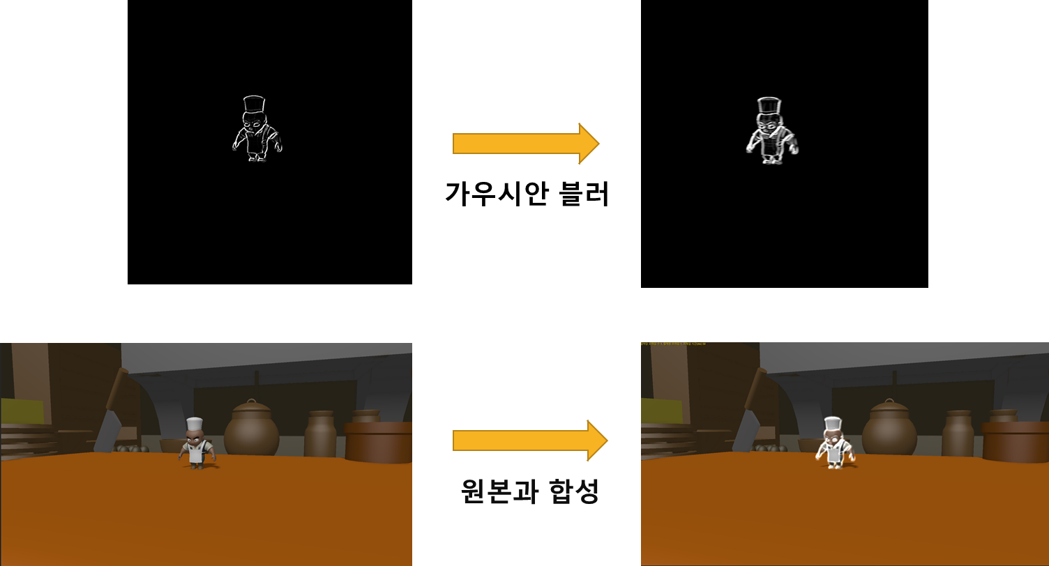 추가적으로, 가우시안 블러를 주고 그 렌더 타겟과 합성하여, 외곽선을 더 강조하는 효과도 개발해봤습니다.